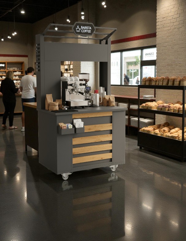 Unsere tragbaren Verkaufsstände sind eine elegante, funktionale und qualitativ hochwertige Antwort auf diesen wachsenden Bedarf. Obwohl im visuellen Beispiel als Kaffeestand dargestellt, sind diese Stände flexibel konzipiert. Sie lassen sich leicht an Kaffee, Çiğ Köfte, Döner, Sandwiches, Waffeln oder andere schnelle Speisen und Getränke anpassen. Je nach Bedarf können sie alle notwendigen Geräte wie Espressomaschinen, Kaffeebohnenbehälter, Tassenlager, Kühlschränke, Heizgeräte, Zubereitungstheken und Vitrinen für Ihre spezifischen Produkte enthalten.