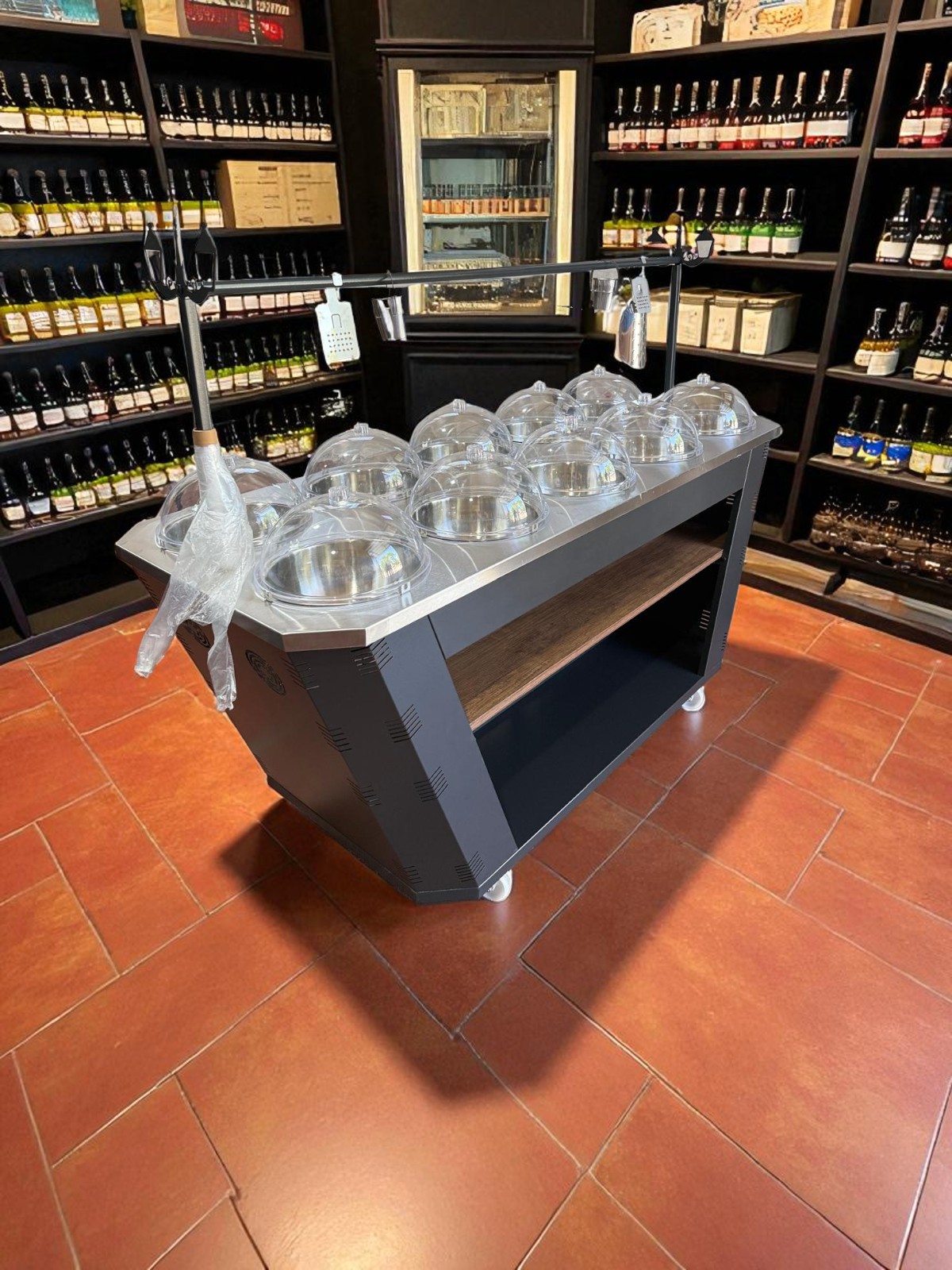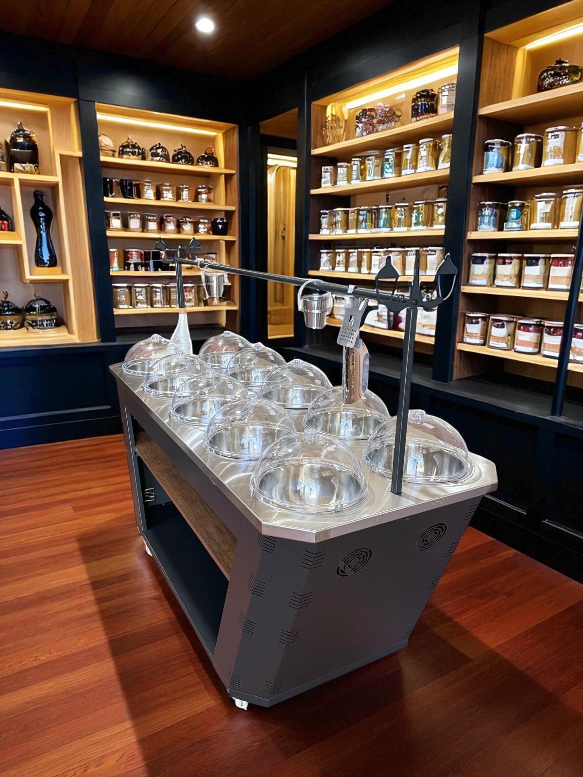 Der Oliven-Präsentationstisch wurde speziell entwickelt, um sowohl optisch ansprechend als auch praktisch im täglichen Gebrauch zu sein. In modernen Supermärkten, Feinkostgeschäften und Delikatessenabteilungen ist die Präsentation der Produkte ein entscheidender Faktor für den Verkaufserfolg – und genau hier überzeugt dieses hochwertige Möbelstück.