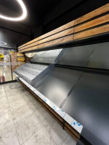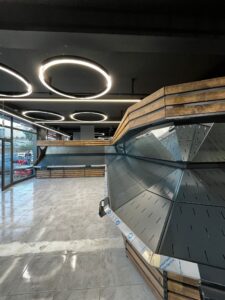 A water collection channel should be installed beneath the main surface. This keeps the display clean, prevents water accumulation, and helps maintain the freshness of the displayed products.