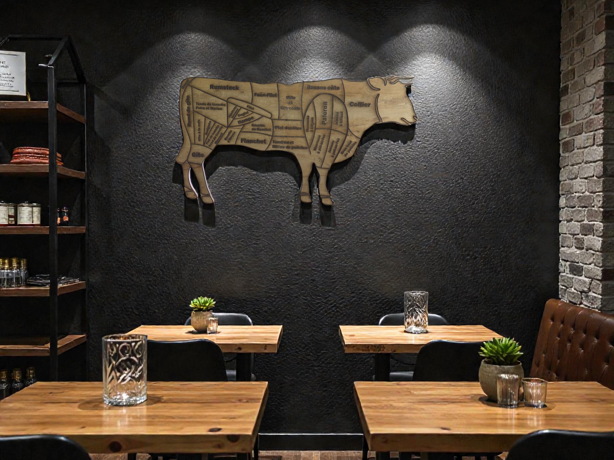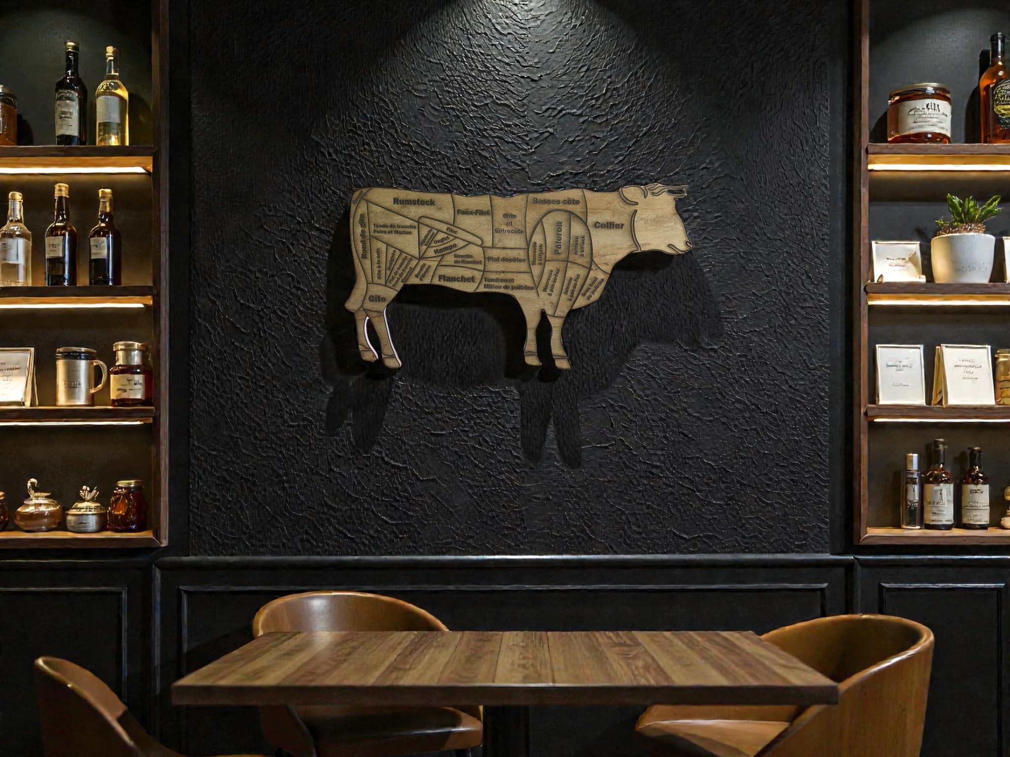 Le bois, grâce à sa texture chaleureuse, crée une ambiance accueillante, bien différente des décors industriels en métal ou en plastique. Placées à l’entrée, au-dessus du comptoir ou dans la vitrine, ces sculptures apportent une identité forte à la boucherie et améliorent sa reconnaissance visuelle.