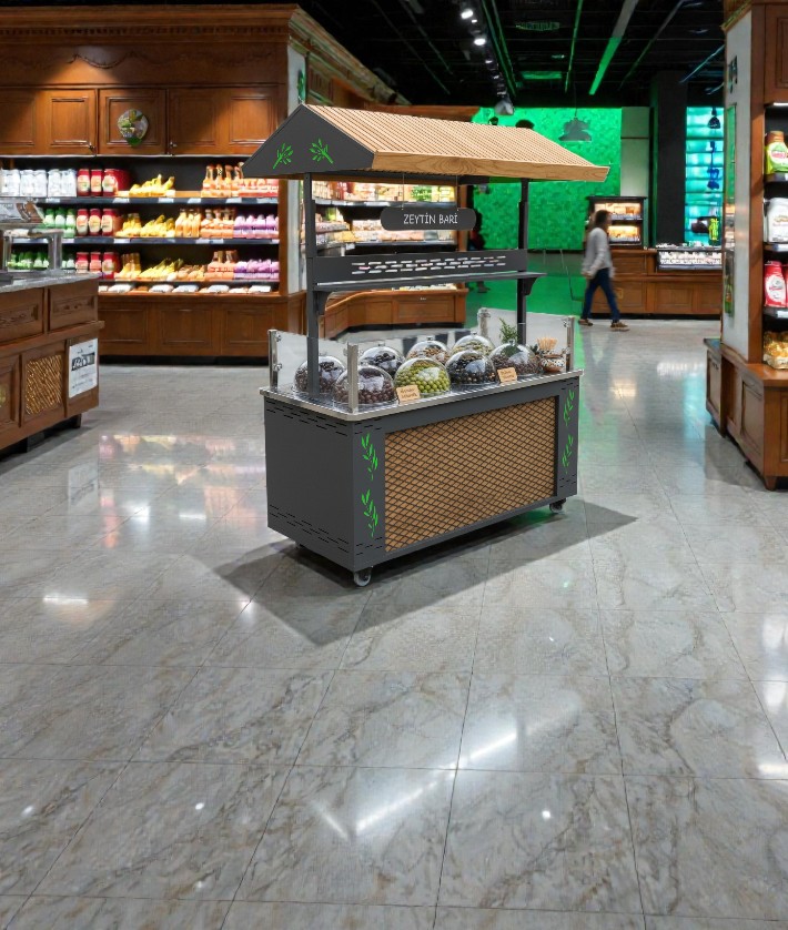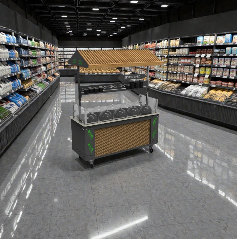 Le stand de présentation d’olives avec toit n’est pas seulement un meuble de vente, mais un véritable outil de mise en valeur du produit. Il attire l’attention, met en confiance et transforme l’olive en une expérience premium.