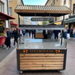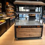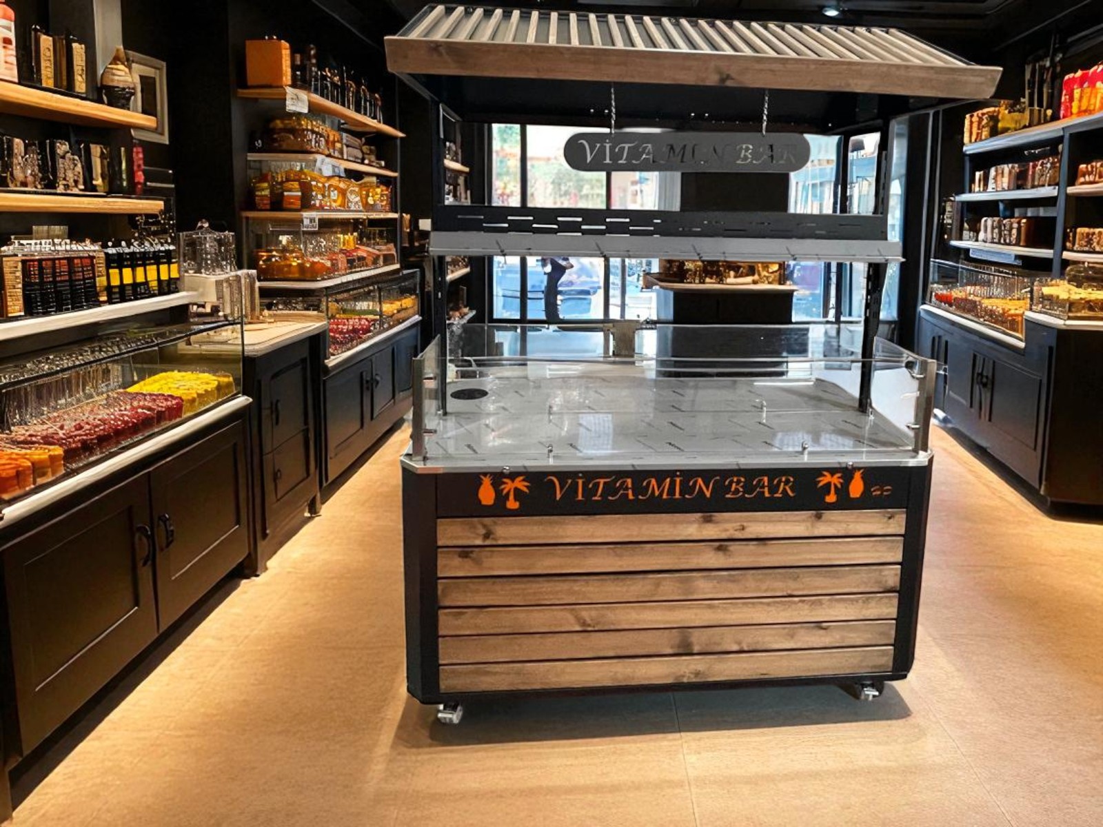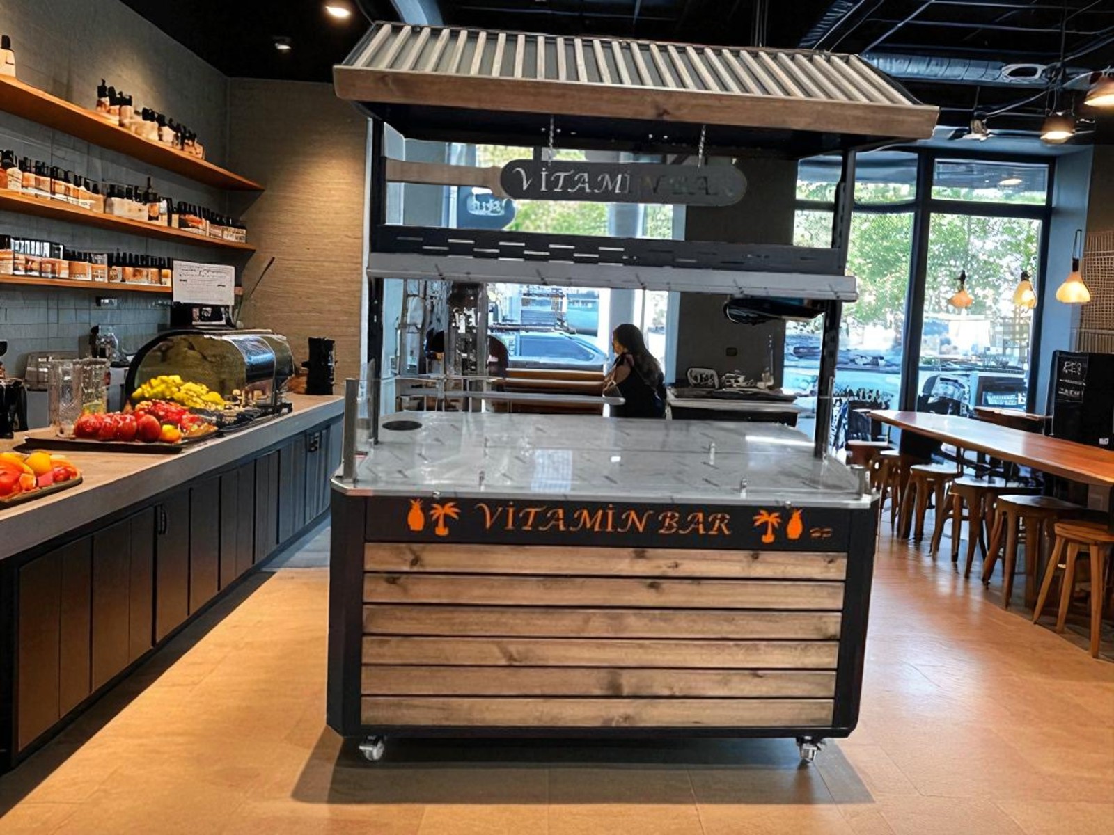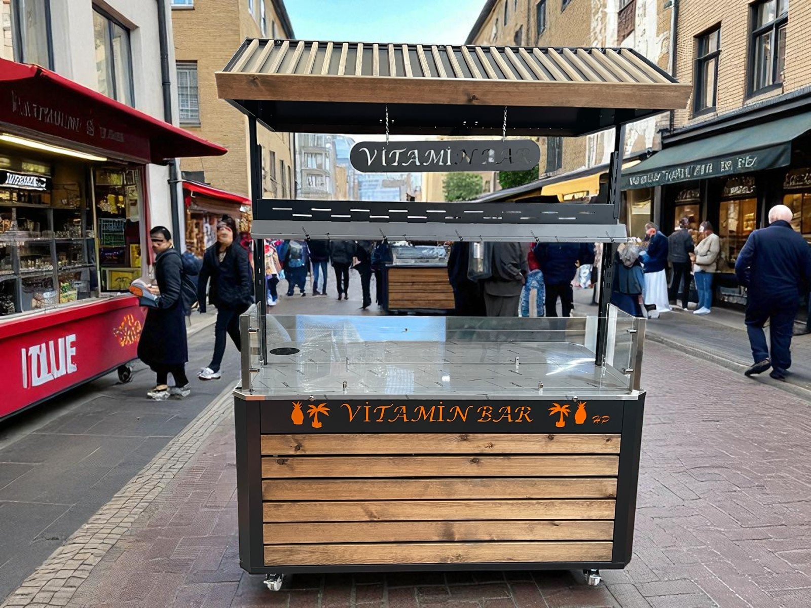 La surface en acier inoxydable garantit durabilité, hygiène et facilité de nettoyage. Sur la partie supérieure, il est possible d’intégrer différentes stations : un stand de jus frais, un bar à vitamines, un poste de cuisson de maïs, un stand de présentation de çiğ köfte ou encore un espace dédié aux spécialités ottomanes. Cette polyvalence permet d’adapter la même table à différents concepts tout au long de la journée.