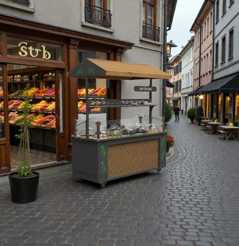 Zeytin; doğallığın, sağlığın ve geleneksel lezzetin simgesidir. Bu kadar güçlü bir ürünü sunarken kullanılan tezgâh da aynı dili konuşmalıdır. Çatılı ve tekerlekli, 10–12 adet zeytin tası taşıyabilen, ahşap ağırlıklı ve inox (paslanmaz çelik) detaylarla desteklenmiş zeytin sunum tezgâhları; organik ürün sunumuna değer katan yeni nesil satış üniteleridir.